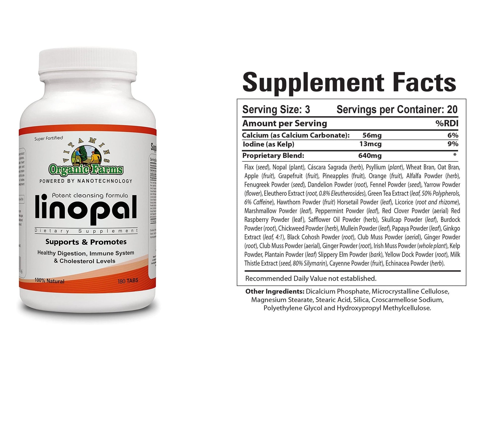 Linopal Ingredients: Apple , Black Cohosh, Burdock (root), Cascara Sagrada, Cayenne Pepper, Chickweed Powder, Club Muss, Dandelion, Echinacea, Eleuthero , Fennel , Fenugreek, Flax, Ginger (Xingiver Officinallis, Ginkgo Biloba, Grapefruit, Green Tea, Hawthorn , Horsetail Powder, Irish Moss, Kelp, Licorice, Marshmallow , Milk Thistle, Mullein , Oat Bran, Orange, Papaya , Peppermint, Pineapple, Plantain Powder, Psyllium, Red Clover, Red Raspberry, Safflower Oil Powder, Skullcap Powder, Slippery Elm, Streptacantha (Nopal), Wheat Bran, Yarrow Powder, Yellow Dock