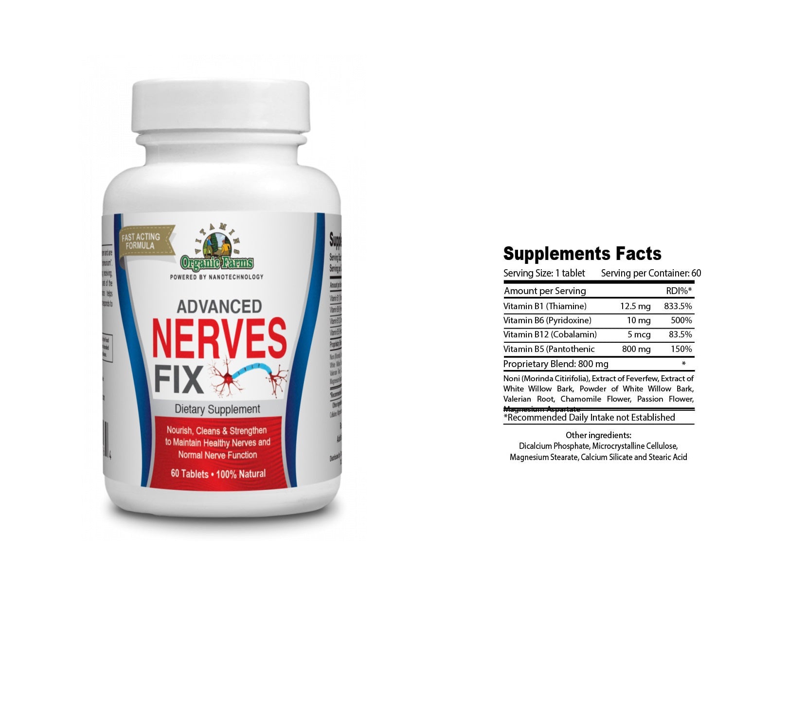 Nerves ingredients: Vitamin B1 (Thiamine), Vitamin B6 (Pyridoxine), Vitamin B12 (Cobalamin), Vitamin B5 (Pantothenic Acid), Noni (Morinda Citirifolia), Extract of Feverfew, Extract of White Willow Bark, Powder of White Willow Bark, Valerian Root, Chamomile Flower, Passion Flower, Magnesium Aspartate