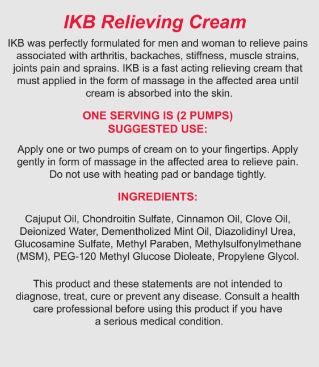 IKB was perfectly formulated for men and woman with ingredients that have been used for many years by people with arthritis, backaches, stiffness, muscle strains, joints pain and sprains. IKB is a fast acting relieving cream that must applied in the form of massage in the affected area until cream is absorbed into the skin.
